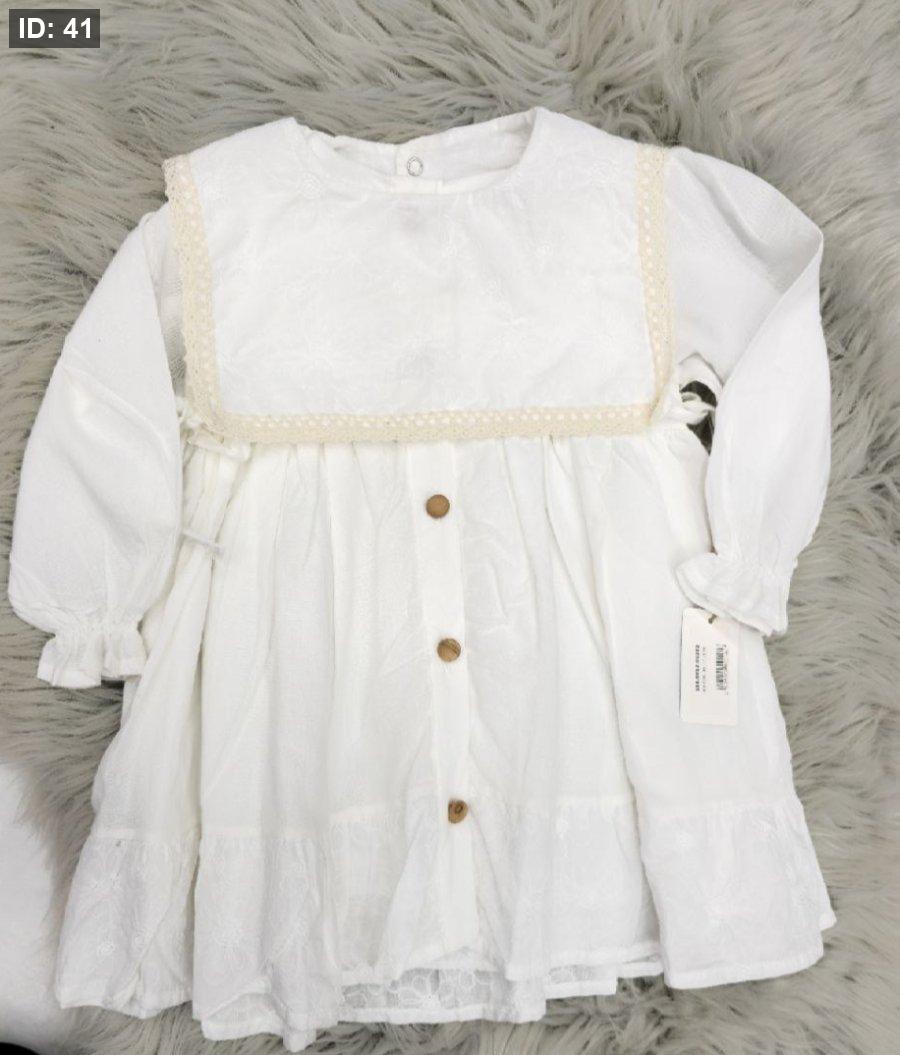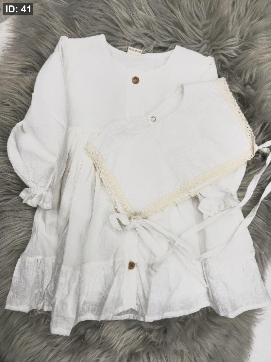 هذا الفستان الأبيض الأنيق مصنوع من قماش قطني ناعم (أو كتان ناعم بناءً على الصورة) لضمان أقصى درجات الراحة لبشرة طفلتك الحساسة.