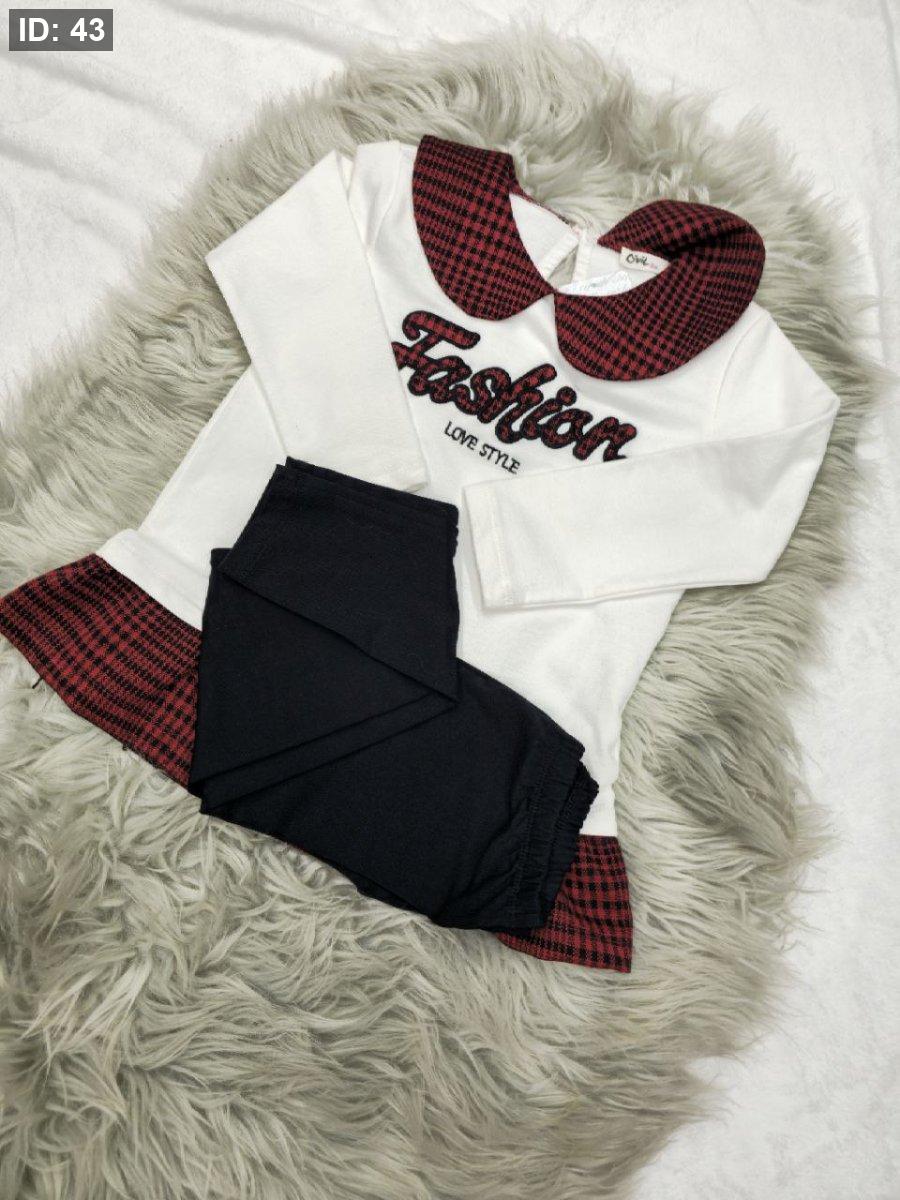 امنحي أميرتك الصغيرة إطلالة ساحرة ومريحة مع هذا الطقم البناتي الأنيق المكون من قطعتين. يتميز الفستان/البلوزة باللون الأبيض الناصع مع ياقة وتفاصيل سفلية بنمط كاروهات أحمر وأسود عصري، مع طباعة أنيقة لعبارة "Fashion LOVE STYLE". يتكامل الطقم مع بنطال أسود سادة يوفر حرية الحركة وراحة فائقة لطفلتك طوال اليوم.